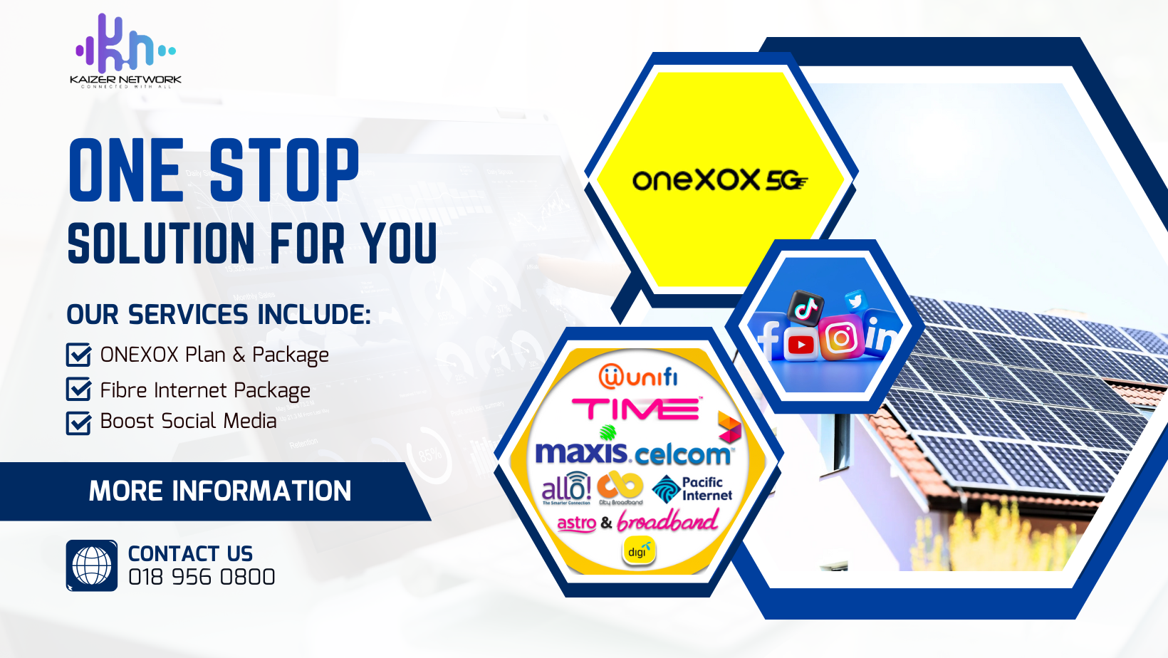 Dengan Kaizer Network, anda boleh dapatkan pelan internet laju & stabil, pemasangan solar rumah yang menjimatkan bil elektrik, serta servis boost media sosial untuk tingkatkan engagement dan followers.